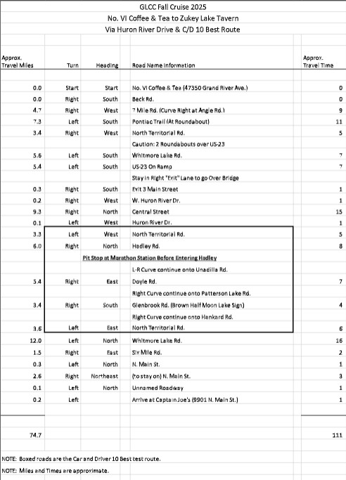 This cruise will take us along the Huron River and through the Car and Driver Route.